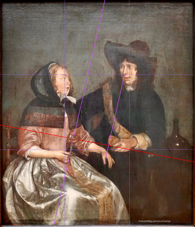 In this Vermeer below, the discreet inclination of the wine (red line) joins on the edge of the format the golden composition grid Phi (in yellow), grid which served as support for the first composition rule by positioning, for the connect, the nose and the eye of the man and the open mouth of the young woman.