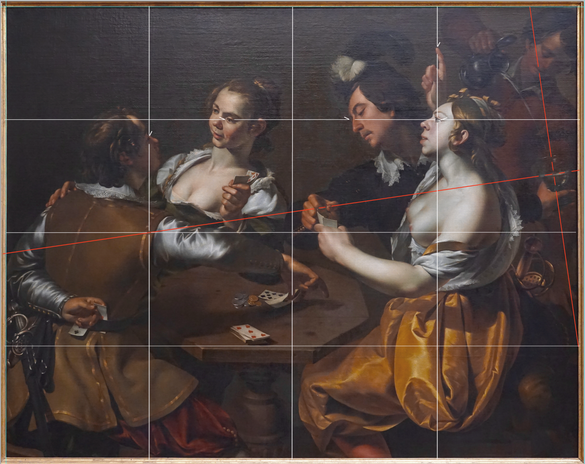 The composition soberly shows, if I can say, the use of tilted wine and two harmonic grids: the wine (or beer?) Is tilted by pointing the mouth of the servant, the little finger and the thumb of the man in black, the deck of cards and the median and half- median grids . These two harmonic grids installed the eyes of the four players and the card game on the table. This provision confirms the relationship between alcohol and card game cheating.